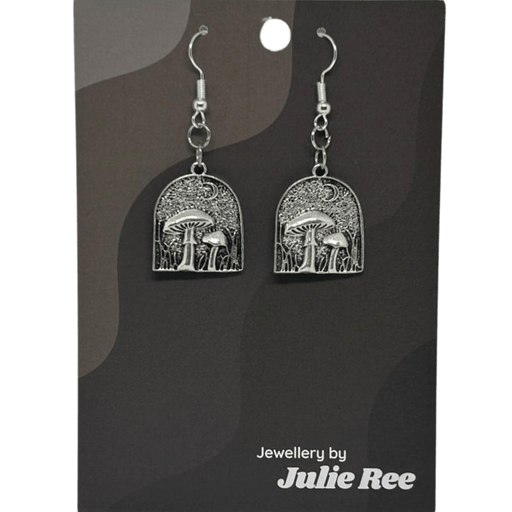 Step into a moonlit forest with these antique-effect mushroom earrings! Featuring an intricate archway design with detailed toadstools and a cresce...