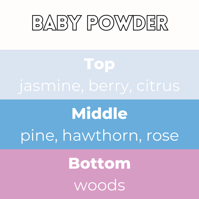 Baby Powder is a soft, comforting wax melt that wraps your space in pure powdery bliss. Delicate floral notes of rose and violet blend beautifully with a smooth base of vanilla, musk, and soft woods. Clean, gentle, and timeless — it’s the scent of comfort, bottled in wax.