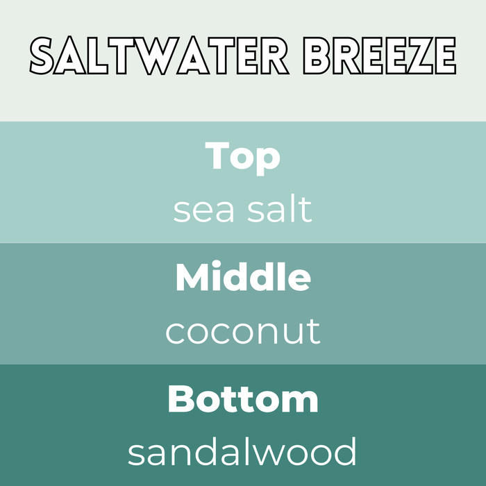 Saltwater Breeze is a refreshing, ocean-inspired wax melt that brings the calm of the coast to your home. Crisp sea salt and airy ozonic notes blend with sweet coconut and peach, evoking tropical shores. A soothing base of sandalwood, moss, and cedarwood adds warmth and depth for the perfect seaside scent experience.