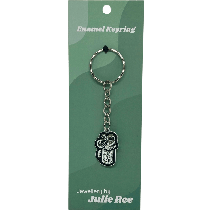 Brewed in darkness, topped with sass. This spooky little enamel keyring features a cheeky ghost floating out of a coffee cup labelled “Black like my soul.”