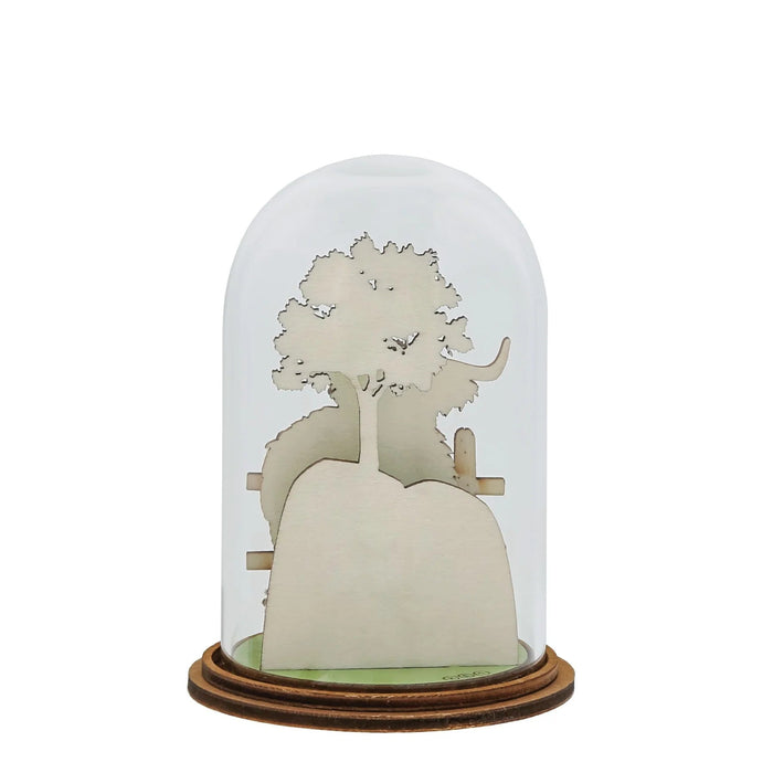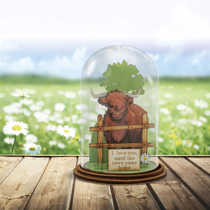 Celebrate your love with this charming Highland Cow Glass Dome Keepsake. Featuring an adorable illustration of a Highland cow, fenced in beneath a lush tree, this keepsake is perfect for adding a rustic touch to any space. The inscription "I love you, until the cows come home" adds a sweet, sentimental message, making it an ideal gift for loved ones or a unique decor piece for your home. Encased in a clear glass dome with a wooden base, this piece combines both warmth and whimsy.