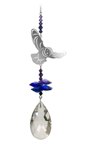 Our Flying Owl has a mirror-finished motif suspended between a matching bead run and a crystal cascade with Deep Midnight colours, completed with a brilliant clear crystal pendant for maximum rainbow-making effects.